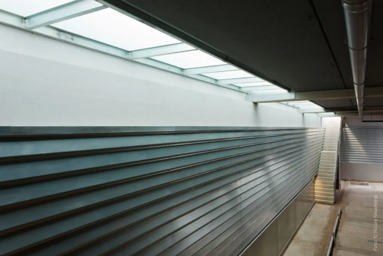 La planta sótano se hizo accesible a vehículos de transporte por una rampa exterior, para acceder al almacén. Esta planta se ilumina naturalmente por un patio pos-