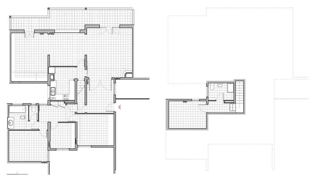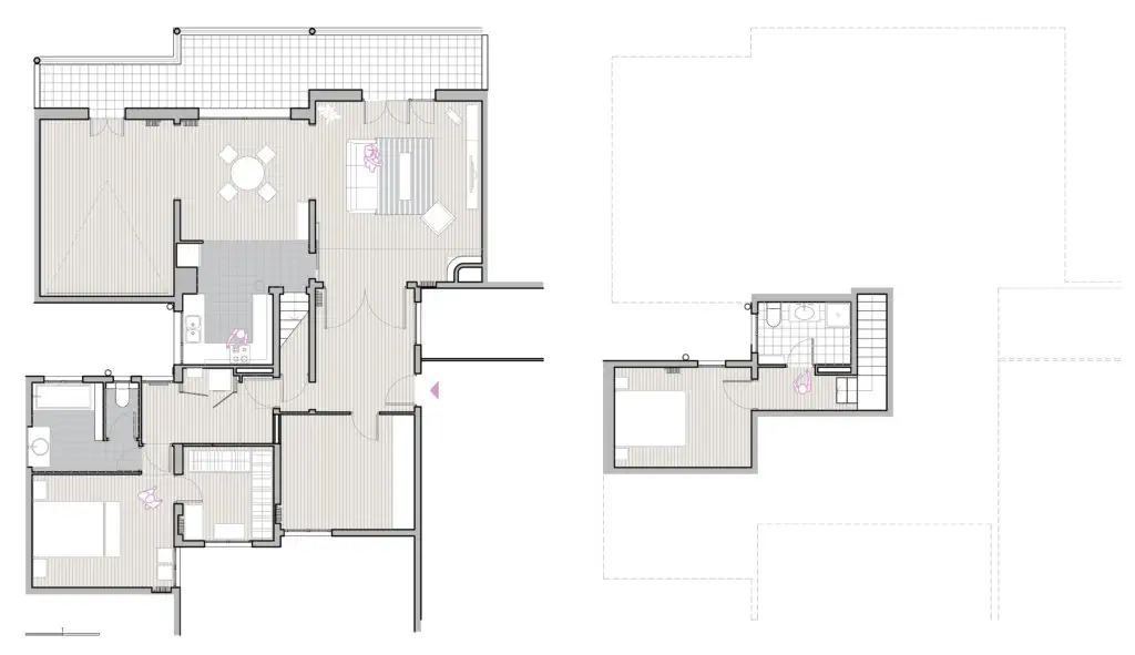 A la nova distribució, la cuina queda oberta al menjador, amagant la caldera i rentadora a una nova estança de màquines. A més, s’ aconsegueix la separació de flu-