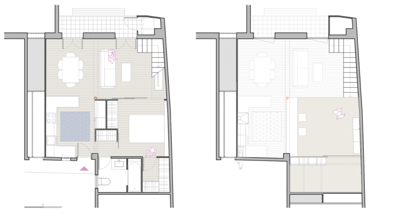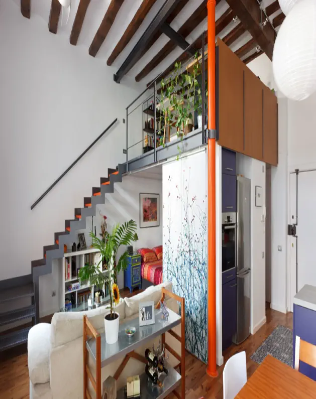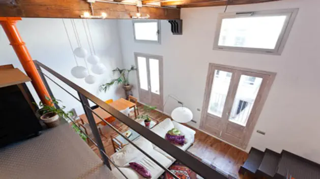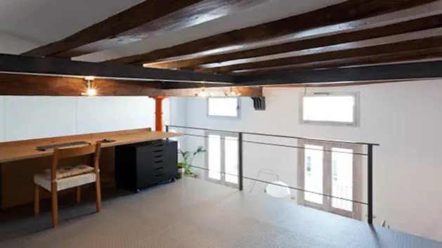 Es tracta d’un apartament diàfan amb una habitació amb bany i vestidor, i l’espai de cuina-menjador-estar. A l’altell hi ha l’estudi i una zona de magatzem, i s’hi puja