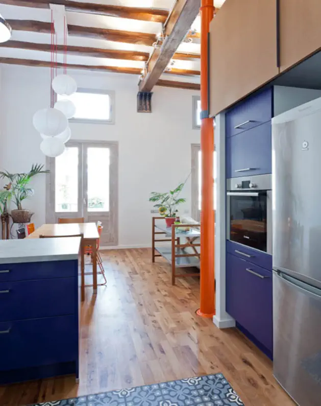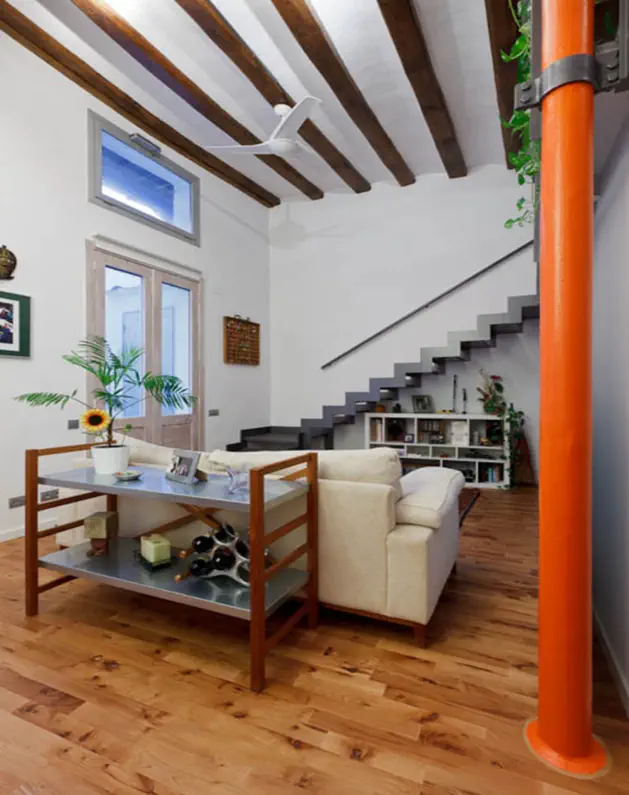 cop netes i restaurades es deixaren aparents, i una columna circular de ferro colat, que exempta i de color taronja, destaca com a element ornamental de l’habitatge.