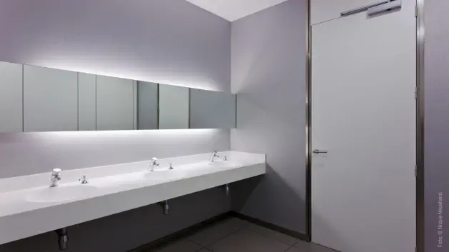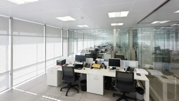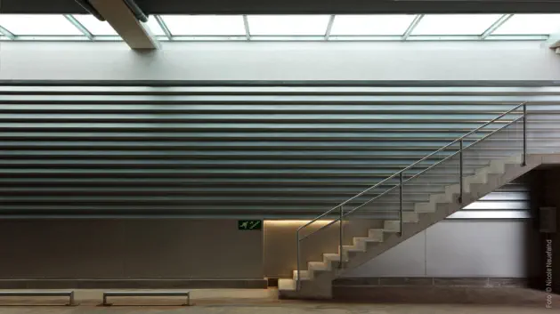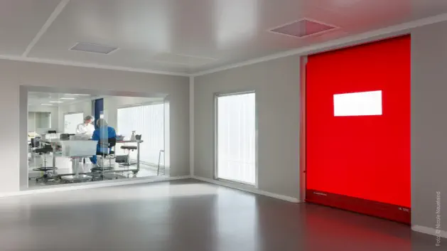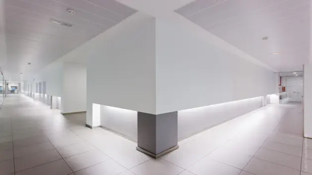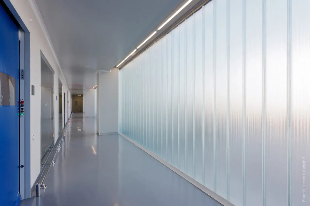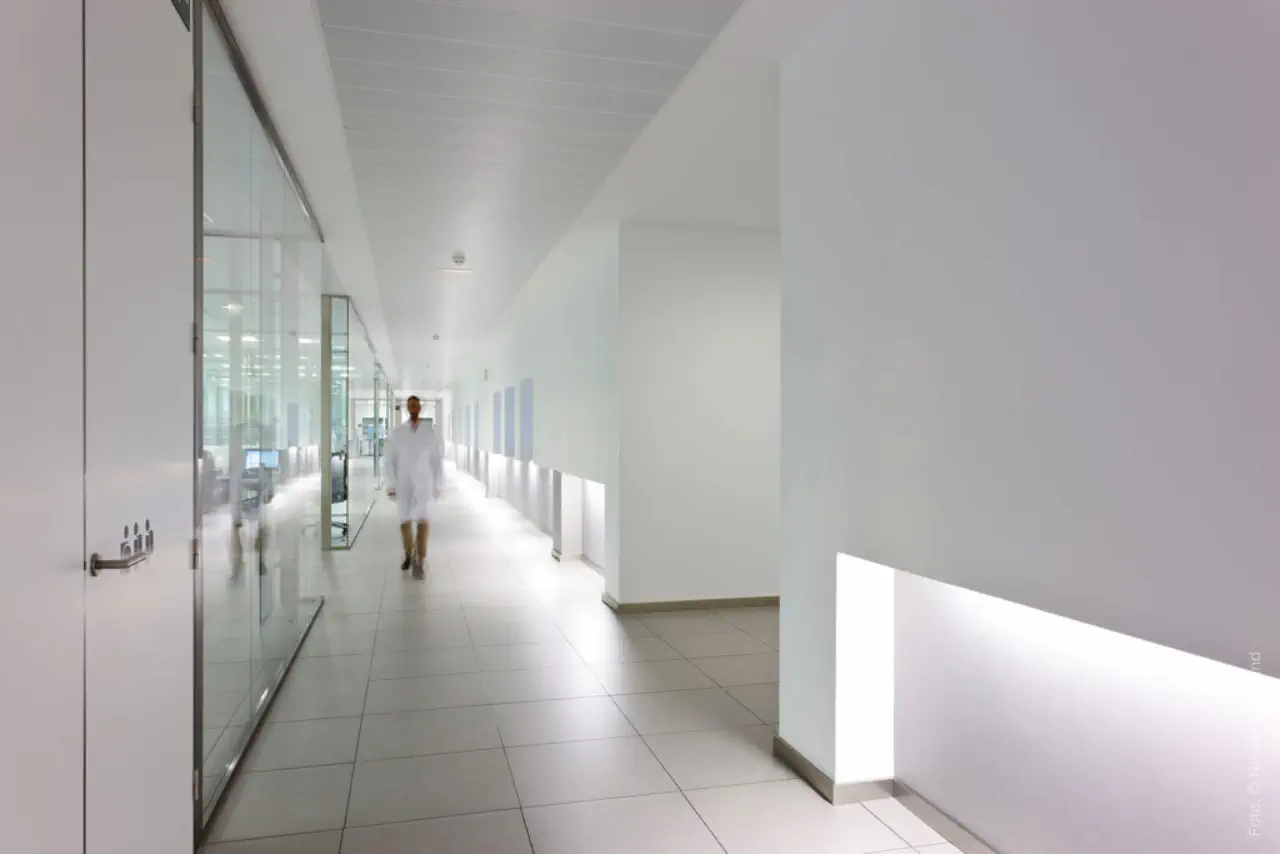 planta queda de gran alçada fins a 9m, permetent una zona tècnica per a instal·lacions, sobre de les sales blanques. La planta primera, en forma d’ L , conté les ofici-